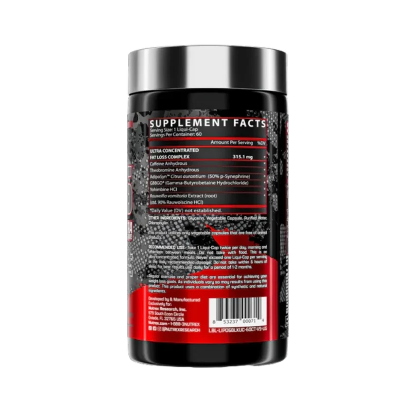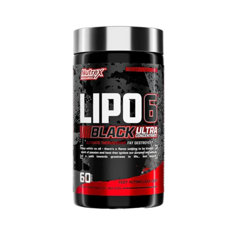 A 100% transparent, research-backed formula for powerful results. Key Components Per Serving (1 Liqui-Cap): – Ultra Concentrated Fat Loss Complex (305mg): – Caffeine Anhydrous – Theobromine Anhydrous – Theacrine (as TeaCrine®) – GBBGO® (Gamma-Butyrobetaine Hydrochloride) – Yohimbine HCl – Rauwolfia vomitoria Extract (root) – Folic Acid: 200 mcg – Vitamin B12: 3 mcg – Biotin: 500 mcgNutrex Research, Lipo-6 Black UC, 60 Capsules, 60 Serving
