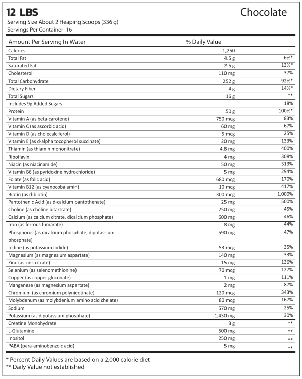 High-Calorie Mass Gainer: Provides 1,250 calories per serving to help increase weight and size.