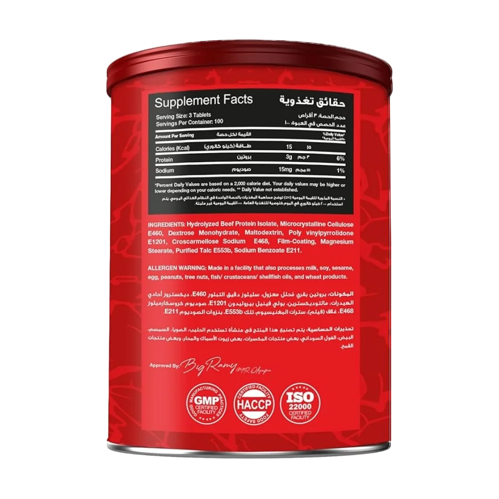 Ingredients: Hydrolyzed Beef Protein Isolate, Microcrystalline Cellulose, Dextrose Monohydrate, Maltodextrin, Polyvinylpyrrolidone, Croscarmellose Sodium, Film-Coating, Magnesium Stearate, Purified Talc, Sodium Benzoate.