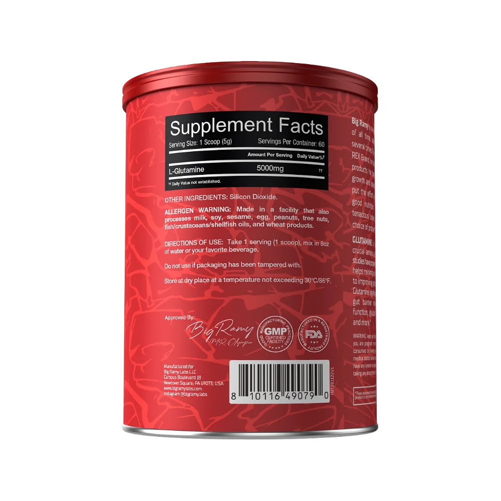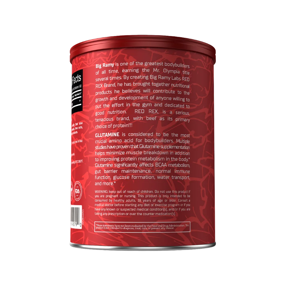 Enhance your recovery and support your immune system with Red Rex Glutamine by Big Ramy Labs. This pure, unflavored glutamine powder provides a potent 5000mg dose of L-Glutamine, the most abundant amino acid in the body. Intense training can deplete glutamine stores, and supplementing with it is crucial for muscle repair, reducing soreness, and maintaining peak performance.