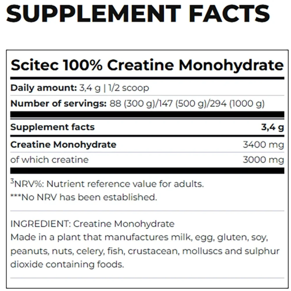 Increase your physical performance with Scitec Nutrition’s 100% Creatine Monohydrate. This vegan food supplement drink powder is formulated with pure, micronized creatine monohydrate, the most researched ergogenic aid for improving strength and power. Each serving provides a potent 3g of pure creatine to fuel your muscles during high-intensity exercise.