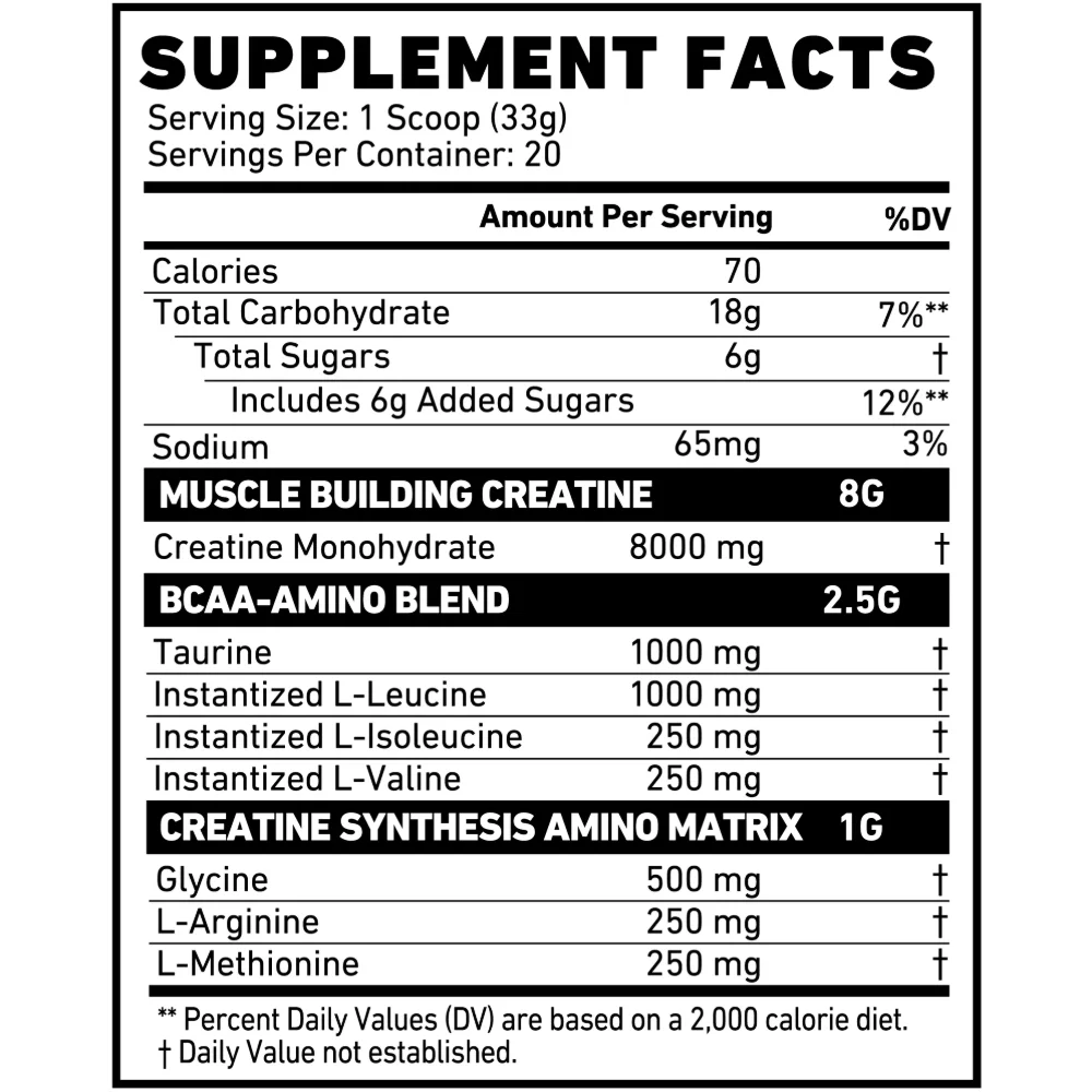 - Massive 8g Dose of Creatine: Packed with 8000mg of Creatine Monohydrate to significantly boost strength, power, and muscle size.