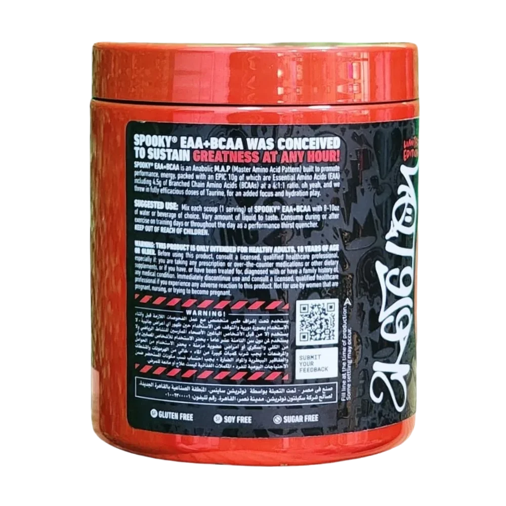 SPOOKY® EAA+BCAA was conceived to sustain greatness at any hour! This limited edition, anabolic M.A.P (Master Amino Acid Pattern) is built to provide everything your body needs to grow. Each serving is loaded with a full spectrum of Essential Amino Acids (EAAs), a potent 4:1:1 ratio of Branched-Chain Amino Acids (BCAAs), and a SPOOKY® Hydration blend. It’s a gluten-free, soy-free, and sugar-free formula for the ultimate performance.