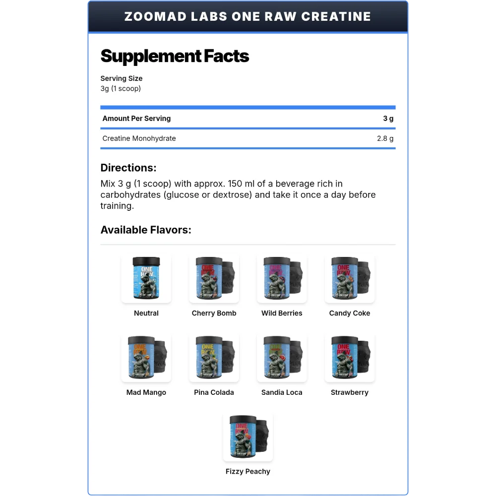 Zoomad Labs One Raw Creatine is a high-quality creatine monohydrate supplement designed to enhance physical performance in successive bursts of short-term, high-intensity exercise. This product is intended for adults performing high-intensity exercise and provides 2.8g of pure creatine per 3g serving.